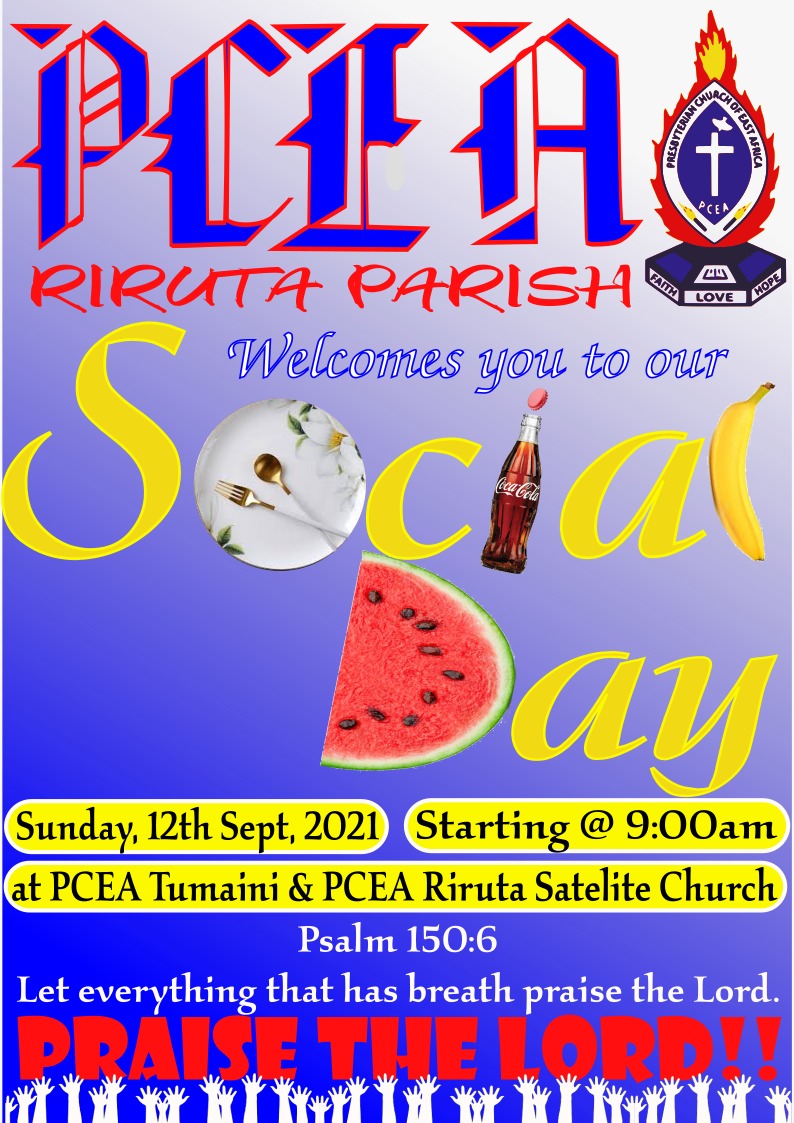 PCEA Riruta Parish welcomes you to a Social Day on Sunday th 12th September 2021 at PCEA Tumaini and PCEA Riruta Satellite Church Psalms 150:6 “Let everything that has breath praise the Lord.”